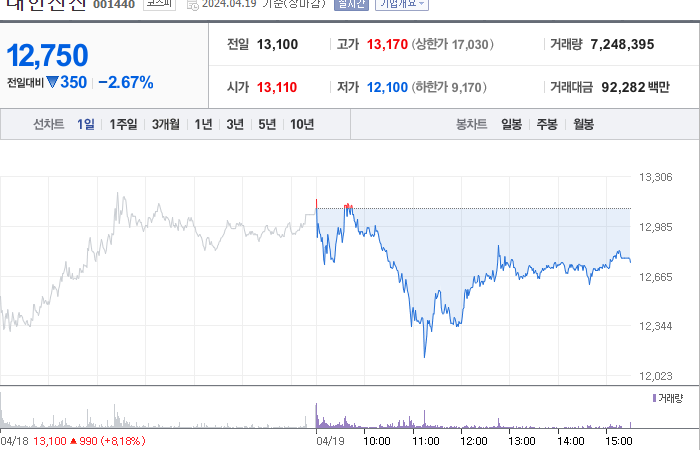 대한전선의 현재 주가는 13,100원으로 전일 대비 -15.96원 하락하였습니다. 대한전선의 대주주인 호반산업(외 2인)은 지분의 41.98%를 소유하고 있습니다. 대한전선은 전기장비 기업으로, 장중 기준 주가는 13,100원입니다. 시가 총액은 2조3772억 원이며 발행 주식수는 186,447,300주입니다. 외국인 보유 비중은 6.72%이며, 장중 거래량은 10,065,225주를 기록하였습니다. 또한, 대한전선은 28,440억 원의 매출액을 달성하였습니다.