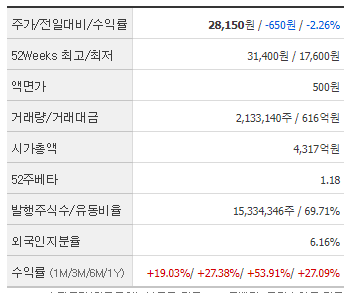 켐트로닉스 현재 주가는 25,950원이며 전일 대비 원의 모습을 보이고 있습니다. 켐트로닉스의 주주현황을 살펴보면 김보균(외 10인)이 지분 27.49%를 소유하고 있습니다. 켐트로닉스는 화학 기업으로 장중 기준으로 주가는 25,950원 입니다. 켐트로닉스의 시가 총액은 3979억 원이며 발행 주식수는 6.72주 입니다. 외국인 보유 비중은 512,817% 이며 장중 거래량은 15,334,346를 기록했습니다. 매출액은 5,423억 원, 영업이익은 225억 원을 달성했습니다. EPS는 없음원이며 켐트로닉스 주식 배당수익률은 1.05% 입니다.