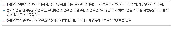 -1983년 설립되어 전자 및 화학사업을 영위하고 있음. 동사가 영위하는 사업부문은 전자사업, 화학사업, 태양광사업이 있음. 전자사업은 전자부품 사업부문, 무선충전 사업부문, 자율주행 사업부문으로 구분되며, 화학사업은 케미칼 사업부문, 디스플레이 사업부문으로 구분됨. 2023년 1분기말 기준 자율주행연구소를 통해 국책과제를 포함한 10건의 연구개발활동이 진행되고 있음.