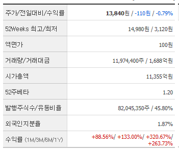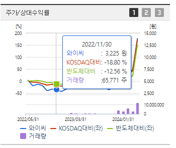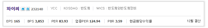 와이씨 현재 주가는 14,090원이며 전일 대비 원의 모습을 보이고 있습니다. 와이씨의 주주현황을 살펴보면 샘텍(외 9인)이 지분 51.98%를 소유하고 있습니다. 와이씨는 반도체 및 관련장비 기업으로 장중 기준으로 주가는 14,090원 입니다. 와이씨의 시가 총액은 1조1560억 원이며 발행 주식수는 1.30주 입니다. 외국인 보유 비중은 55,314,549% 이며 장중 거래량은 82,045,350를 기록했습니다. 매출액은 2,552억 원, 영업이익은 364억 원을 달성했습니다. EPS는 없음원이며 와이씨 주식 배당수익률은 % 입니다.