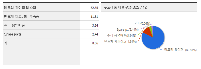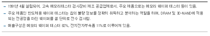 -1991년 4월 설립되어, 고속 메모리테스터 검사장비 제조 공급업체로서, 주요 제품으로는 메모리 웨이퍼 테스터 등이 있음. 주요 제품인 반도체용 웨이퍼 테스터는 칩의 불량 정보를 정확히 취득하고 분석하는 역할을 하며, DRAM 및 3D-NAND에 적용되는 전공정을 마친 웨이퍼를 셀 단위로 전수 검사함. 매출구성은 메모리 웨이퍼 테스터 82%, 전지전자부속품 11%로 이루어져 있음.