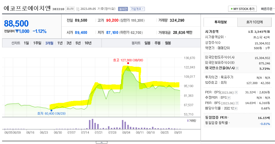 에코프로에이치엔 현재 주가는 89,500원이며 전일 대비 -500원의 모습을 보이고 있습니다. 에코프로에이치엔의 주주현황을 살펴보면 에코프로(외 9인)이 지분 31.55%를 소유하고 있습니다. 에코프로에이치엔는 상업서비스 기업으로 장중 기준으로 주가는 89,500원 입니다. 삼성전자의 시가 총액은 1조3545억 원이며 발행 주식수는 5.72주 입니다. 외국인 보유 비중은 283,534% 이며 장중 거래량은 15,304,932를 기록했습니다. 매출액은 1,160억 원, 영업이익은 414억 원을 달성했습니다. EPS는 없음원이며 에코프로에이치엔 주식 배당수익률은 0.72% 입니다.