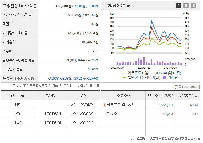 -동사는 2016년 5월 1일을 분할기일로 하여 에코프로의 이차전지소재 사업부문이 물적분할되어 신설되었음. 2019년 3월 코스닥 시장에 상장하였음. 2013년 하이니켈계 양극소재 중심으로 사업을 재편한 이후 NCA 분야에서 시장점유율을 꾸준히 높여 왔음. 글로벌 Non-IT용 NCA 양극재 수요 확대와 국내외 EV용 하이니켈계 양극재 판매 호조가 계속되는 가운데 세계 시장 점유율을 지속적으로 확대해나가고 있음.