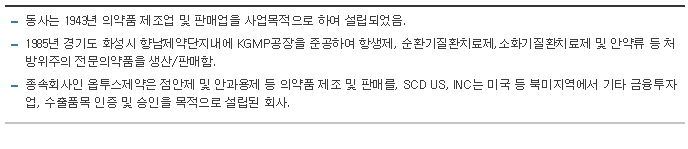-동사는 1943년 의약품 제조업 및 판매업을 사업목적으로 하여 설립되었음. 1985년 경기도 화성시 향남제약단지내에 KGMP공장을 준공하여 항생제, 순환기질환치료제,소화기질환치료제 및 안약류 등 처방위주의 전문의약품을 생산/판매함. 종속회사인 옵투스제약은 점안제 및 안과용제 등 의약품 제조 및 판매를, SCD US, INC는 미국 등 북미지역에서 기타 금융투자업, 수출품목 인증 및 승인을 목적으로 설립된 회사.