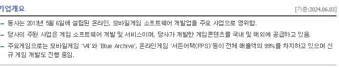 -동사는 2013년 5월 6일에 설립된 온라인, 모바일게임 소프트웨어 개발업을 주요 사업으로 영위함. 당사의 주된 사업은 게임 소프트웨어 개발 및 서비스이며, 당사가 개발한 게임콘텐츠를 국내 및 해외에 공급하고 있음. 주요게임으로는 모바일게임 'V4'와 'Blue Archive', 온라인게임 '서든어택(FPS)'등이 전체 매출액의 99%를 차지하고 있으며 신규 게임 개발도 진행 중임.