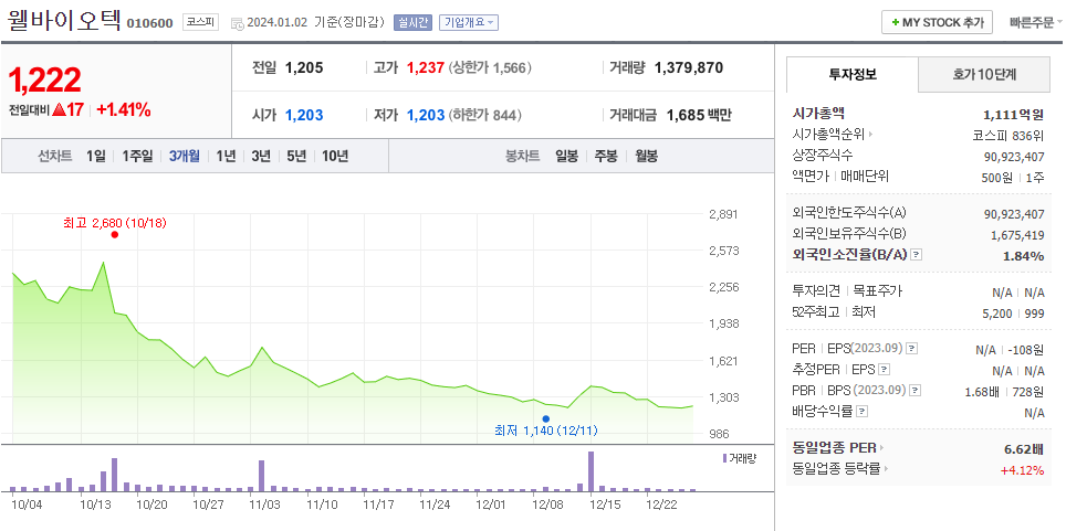 웰바이오텍 현재 주가는 1,205원이며 전일 대비 -6원의 모습을 보이고 있습니다. 웰바이오텍의 주주현황을 살펴보면 이 지분 7.01%를 소유하고 있습니다. 웰바이오텍는 해상운수 기업으로 장중 기준으로 주가는 1,205원 입니다. 웰바이오텍의 시가 총액은 1111억 원이며 발행 주식수는 1.84주 입니다. 외국인 보유 비중은 1,113,058% 이며 장중 거래량은 90,923,407를 기록했습니다. 매출액은 779억 원, 영업이익은 26억 원을 달성했습니다. EPS는 없음원이며 웰바이오텍 주식 배당수익률은 2.41% 입니다.