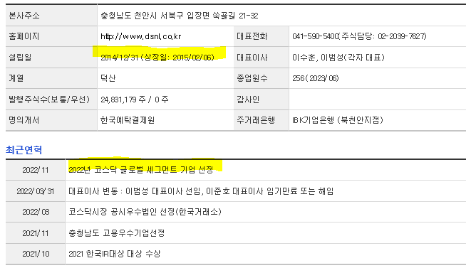 덕산네오룩스는 디스플레이 및 관련부품 기업입니다. 대표자는 이수훈, 이범성(각자 대표) 이며 설립일은 2014/12/31, 주식 상장일은 2015/02/06입니다. 전체 종업원 수는239명 이고 본사 주소는 충남 천안시 서북구 입장면 쑥골길 21-32입니다.