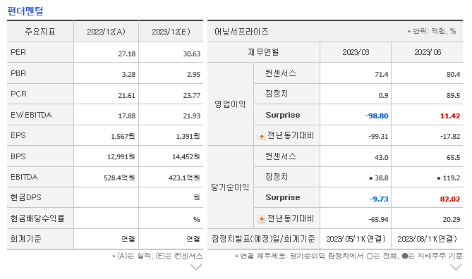 -2023년 3월 전년동기 대비 연결기준 매출액은 31.7% 감소, 영업이익은 99.3% 감소, 당기순이익은 65.9% 감소. 동사 매출액은 전년 동기 대비 감소하면서 매출원가도 함께 감소했지만 판관비는 오히려 큰 폭으로 상승해 영업이익이 전년 동기 대비 감소함. 동사는 전년 동기 대비 금융수익이 큰 폭으로 증가했으며, 법인세 비용도 감소했지만 영업이익의 감소폭이 커 당기순이익도 감소함.