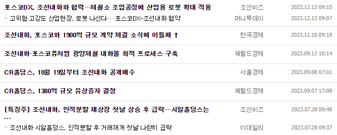 -2023년 9월 전년동기 대비 연결기준 매출액은 1% 감소, 영업이익은 23.8% 감소, 당기순이익은 84.6% 감소. 매출은 소폭 감소하였으나 매출원가 감소폭이 더 적고 판관비가 증가함에 따라 영업이익 감소함. 2023년 7월 1일을 분할기일로 하여 영위하는 사업을 인적분할하여 조선내화 주식회사를 설립하였음. 신설회사는 미래 성장전략을 추진하고 동사는 전략적 컨트롤 타워 역할을 할 계획임.