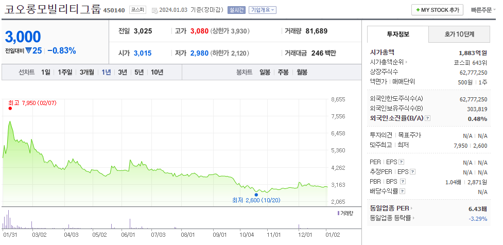 이 글에서는 코오롱모빌리티그룹 주가 전망과 목표 주가, 기업 정보에 대해서 설명합니다. 주식 거래에서 중요한 부분은 현재 기업 가치보다는 미래의 기업 가치를 예측하고 먼저 행동하는 것입니다. 투자할 종목을 고르기 전에 현재 기업의 상황과 지표를 살펴보는 것이 중요합니다. 코오롱모빌리티그룹 주식의 주요 현황과 투자 정보를 확인하시고 주식 투자에 유용한 자료들을 정리하여 제공하오니 효율적인 투자를 해보세요..
