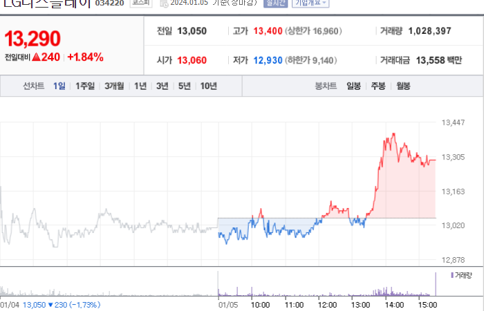 LG디스플레이 주식에 대한 개요를 알려드리겠습니다. LG디스플레이는 세계적인 디스플레이 제조사로서 전문적인 기술력과 경쟁력을 보유하고 있습니다. 베트남, 중국 등 다수의 생산공장을 보유하며, OLED와 LCD를 비롯한 다양한 디스플레이 제품을 생산하고 있습니다. 최근에는 고해상도, 낮은 에너지 소비 등의 기술적인 혁신을 통해 시장에서 큰 인기를 얻고 있습니다. LG디스플레이의 주가는 시장에서 경쟁사와의 신기술 경쟁이나 원자재 가격 등에 따라 변동될 수 있습니다. 즉각적인 투자 결정을 하실 때에는 시장 동향과 기술적인 요소들을 정확히 분석하고 평가해야 합니다. 이처럼 LG디스플레이 주식에 투자할 경우에는 투자 위험성을 감안하고 신중한 결정을 내리셔야 합니다.