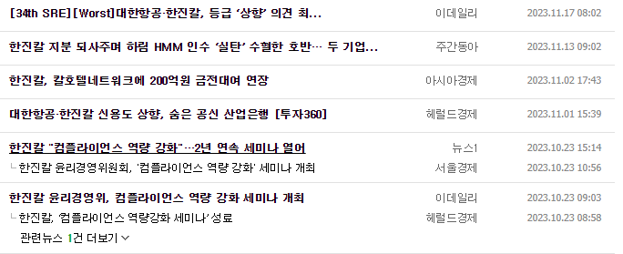 -동사는 2013년 8월 1일을 분할기준일로 대한항공으로부터 인적분할 방식으로 설립되었으며, 2013년 9월 16일 유가증권시장에 상장함. 지주회사로서 다른 회사의 주식을 소유한 회사로 실질적인 지배권을 취득하는 것을 사업의 목적으로 하는 회사임. 2023년 11월 2일 '유형자산 처분결정(종속회사의 주요경영사항) 철회'가 공시됨. 거래상대방의 매금대금 조정 등 중요한 거래 조건 변경 요구에 따른 계약 체결 지연으로 거래 철회함.