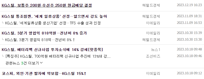 -2023년 9월 전년동기 대비 연결기준 매출액은 13.9% 감소, 영업이익은 16.3% 감소, 당기순이익은 6.9% 감소. 매출이 감소하고 판관비는 증가하면서 영업이익과 당기순이익은 감소하고 있음. KG모빌리티가 KG그룹에 완전 편입되면서 동사의 차량용 철강재 판매 증가에 대한 기대감이 있음. 꾸준한 설비 투자와 기술 개발이 이뤄지고 있어 중장기적 관점의 기대감은 유효함.