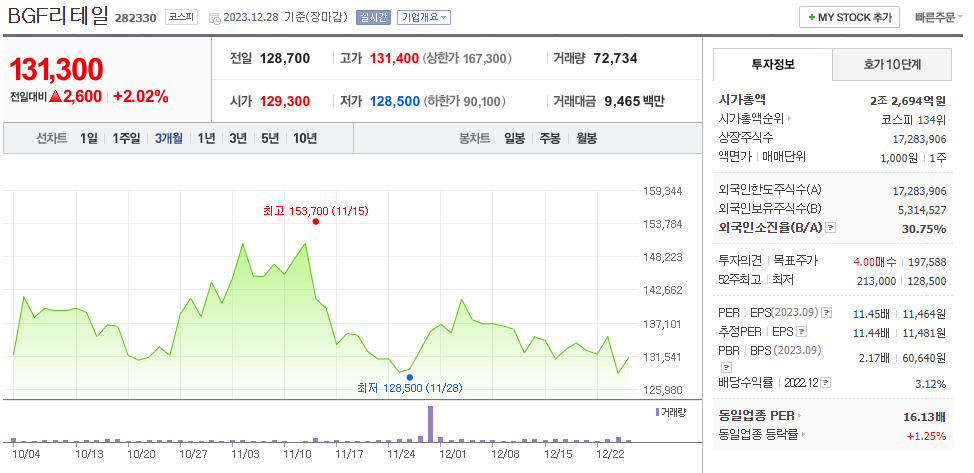 이 글에서는 BGF리테일 주가 전망과 목표 주가, 기업 정보에 대해서 설명합니다. 주식 시장에서 중요한 것은 미래의 기업 가치를 예측하고 선제적으로 움직이는 것입니다. 투자할 종목을 고르기 전에 현재 기업의 현황과 데이터를 확인하는 것이 필요합니다. BGF리테일 주식의 주요 현황과 투자 정보를 확인하시고 주식 투자에 도움이 될 만한 정보들을 모아놓았으니 투자 전에 확인해보시기 바랍니다..