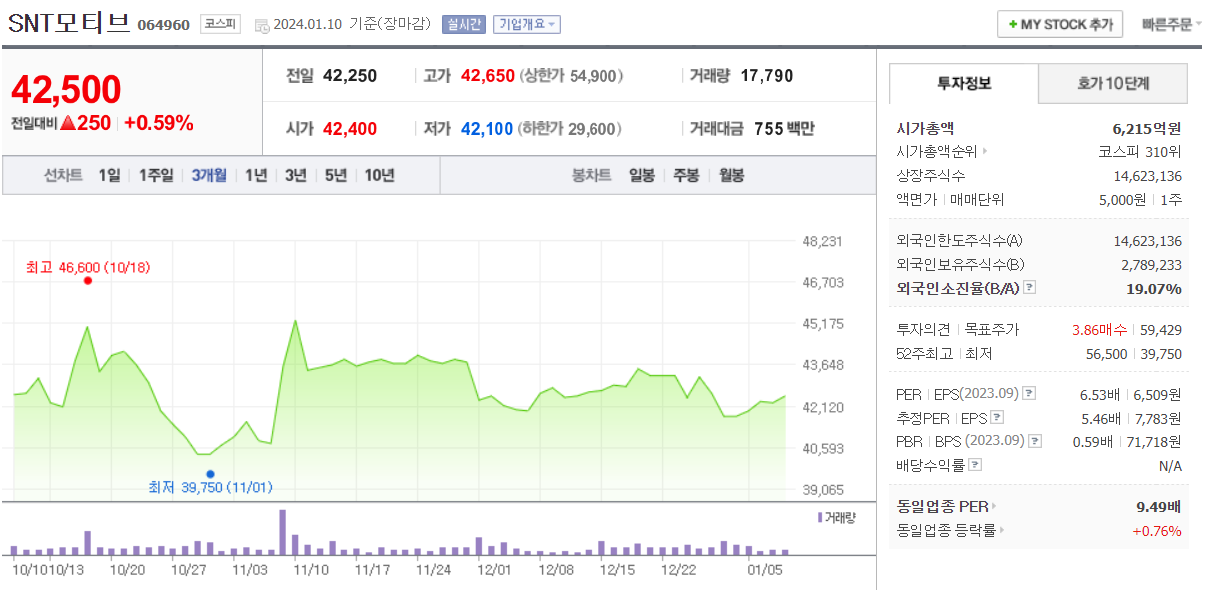 SNT모티브 현재 주가는 42,250원이며 전일 대비 -50원의 모습을 보이고 있습니다. SNT모티브의 주주현황을 살펴보면 S&T홀딩스(외 1인)이 지분 41.10%를 소유하고 있습니다. SNT모티브는 자동차부품 기업으로 장중 기준으로 주가는 42,250원 입니다. SNT모티브의 시가 총액은 6215억 원이며 발행 주식수는 19.07주 입니다. 외국인 보유 비중은 19,917% 이며 장중 거래량은 14,623,136를 기록했습니다. 매출액은 8,515억 원, 영업이익은 1,119억 원을 달성했습니다. EPS는 7,783원이며 SNT모티브 주식 배당수익률은 0.83% 입니다.