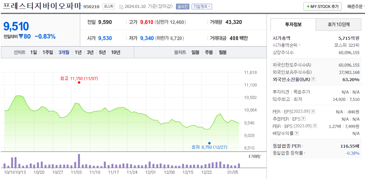 프레스티지바이오파마 주가