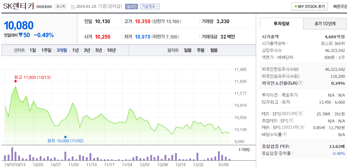 이 글에서는 SK렌터카 주가 전망과 목표 주가, 기업 정보에 대해서 설명합니다. 주식 시장에서 중요한 것은 미래의 기업 가치를 예측하고 선제적으로 움직이는 것입니다. 투자 대상을 선택하기 전에 현재 기업의 현황과 데이터를 확인하는 것이 필요합니다. SK렌터카 주식의 주요 현황과 투자 정보를 확인하시고 주식 투자에 유용한 정보들을 한 곳에 정리해두었으니 투자 전에 확인하시기 바랍니다..
