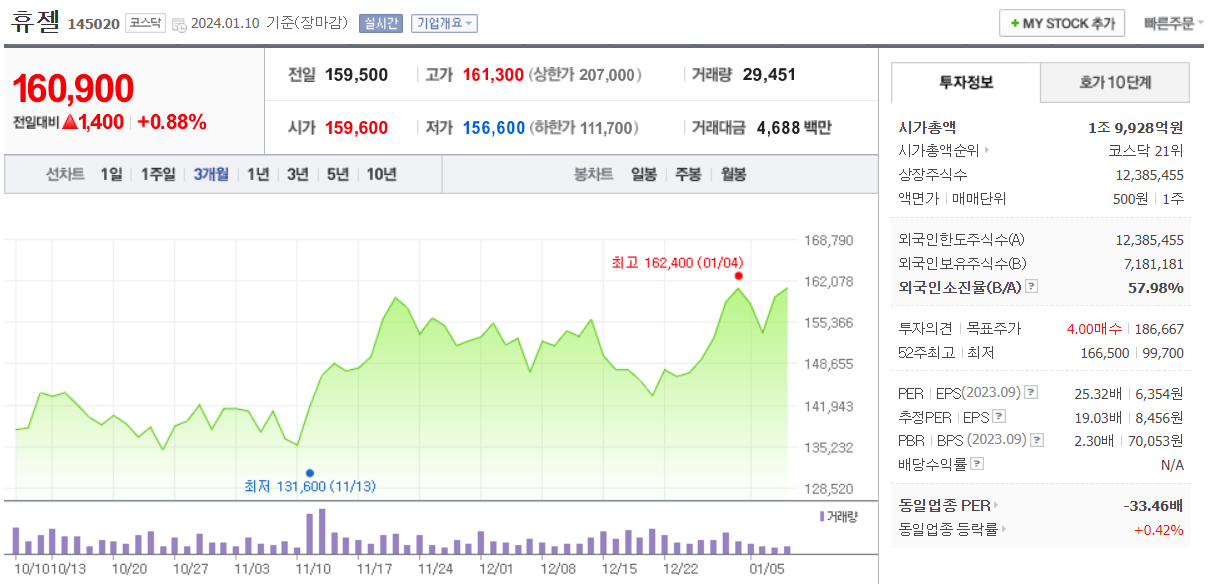 이 글에서는 휴젤 주가 전망과 목표 주가, 기업 정보에 대해서 설명합니다. 주식 거래에서 중요한 부분은 현재 기업 가치보다는 미래의 기업 가치를 예측하고 먼저 행동하는 것입니다. 투자할 종목을 고르기 전에 현재 기업의 상황과 지표를 살펴보는 것이 중요합니다. 휴젤 주식의 주요 현황과 투자 정보를 확인하시고 주식 투자에 도움이 될 만한 정보들을 모아 놓았으니 투자 시 참고하시기 바랍니다..