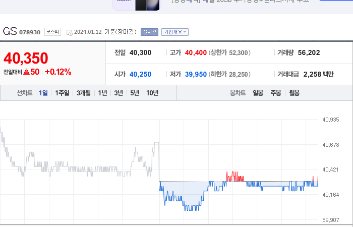 GS 주식의 현재 가격은 40,350원이며 전일 대비 -3.70원 하락하였습니다. 허창수(외 57인)은 GS의 주주로서 지분의 53.19%를 소유하고 있습니다. GS는 석유 및 가스 기업으로서, 현재 주식의 가격은 40,350원입니다. GS의 시가 총액은 3조 7491억 원이며, 발행 주식수는 92,915,378주입니다. 외국인 보유 비중은 23.63%이며, 장중 거래량은 56,222주입니다. 또한, GS는 매출액으로 194,865억 원을 달성하였습니다.