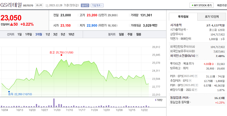 GS리테일 현재 주가는 23,000원이며 전일 대비 -900원의 모습을 보이고 있습니다. GS리테일의 주주현황을 살펴보면 GS(외 1인)이 지분 57.90%를 소유하고 있습니다. GS리테일는 도소매 기업으로 장중 기준으로 주가는 23,000원 입니다. GS리테일의 시가 총액은 2조4137억 원이며 발행 주식수는 7.48주 입니다. 외국인 보유 비중은 296,012% 이며 장중 거래량은 104,717,922를 기록했습니다. 매출액은 87,482억 원, 영업이익은 2,451억 원을 달성했습니다. EPS는 1,808원이며 GS리테일 주식 배당수익률은 1.53% 입니다.