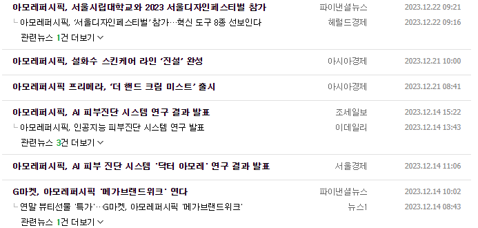-동사의 주요 종속회사는 아모레퍼시픽, 이니스프리, 에뛰드, 아모스프로페셔널, 에스쁘아, 오설록, 농업회사법인 오설록농장, 코스비전으로 총 7개사 임. 프리미엄 시장에서 ‘마몽드’는 플라워 스토리를 체험할 수 있는 플래그십 스토어 오픈을 통하여 고객에게 차별화된 브랜드 경험을 제공하고 있음. 생활용품부문의 오랄 카테고리에서 자연주의 덴탈케어 브랜드 ‘플레시아’를 출시하여 고객 저변을 확대하고있음.