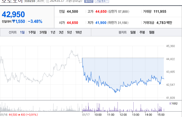 보로노이의 현재 주가는 44,500원이며 전일 대비 원의 모습을 보이고 있습니다. 김현태(외 5인)이 보로노이의 주주로 지분 40.76%를 소유하고 있습니다. 보로노이는 제약 기업으로, 장중 기준 주가는 44,500원입니다. 시가 총액은 7473억 원이며 발행 주식수는 17,398,807주입니다. 외국인 보유 비중은 2.37%이며 장중 거래량은 133,868주를 기록했습니다. 또한, 매출액은 억 원을 달성했습니다.