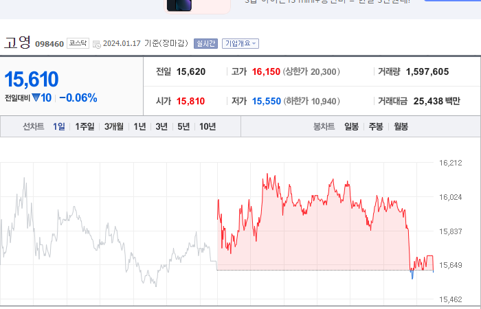 고영의 현재 주가는 15,620원으로, 전일 대비 원의 모습을 보이고 있습니다. 주주현황을 살펴보면 고영홀딩스(외 16인)이 지분의 20.92%를 소유하고 있습니다. 고영은 전자 장비 및 기기 기업으로, 장중 기준으로 주가는 15,620원입니다. 시가 총액은 1조 717억 원이며, 발행 주식수는 68,654,755주입니다. 외국인 보유 비중은 44.93%이며, 장중 거래량은 1,555,494를 기록했습니다. 매출액은 1,668억 원을 달성했습니다.