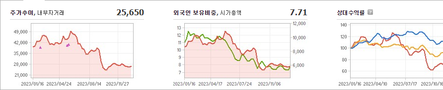 네오위즈의 현재 주가는 25,650원이며 전일 대비 -400원의 변동을 보여주고 있습니다. 네오위즈의 대주주는 나성균(외 10인)으로, 지분 비율은 37.19%입니다. 이 회사는 게임 소프트웨어 기업으로 분류되며, 현재 주가는 25,650원입니다. 네오위즈의 시가 총액은 5552억 원이며, 발행 주식수는 22,033,719주입니다. 외국인 보유 비중은 7.71%이며, 장중 거래량은 90,581주를 기록했습니다. 또한, 이 회사의 매출액은 2,562억 원을 달성했습니다.