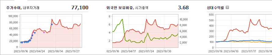 엠로의 현재 주가는 77,100원이며 전일 대비 -2,900원의 하락을 보였습니다. 주주 구성을 살펴보면 삼성에스디에스를 포함한 외국인 2인이 지분의 38.34%를 소유하고 있습니다. 엠로는 일반 소프트웨어 기업으로, 현재 주가는 77,100원입니다. 시가 총액은 8084억 원이며 발행 주식수는 11,212,120주입니다. 외국인 보유 비중은 3.68%이며, 장중 거래량은 229,714주를 기록했습니다. 또한 매출액은 458억 원을 달성했습니다.