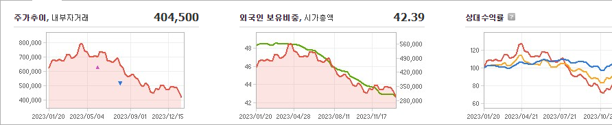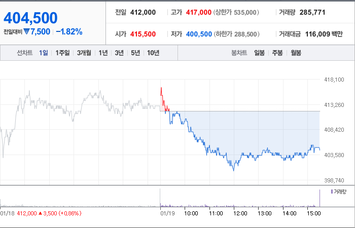 LG화학의 현재 주가는 404,500원이며 전일 대비 -7,500원 하락하고 있습니다. 주주현황을 살펴보면 LG(외 2인)이 지분의 33.37%를 소유하고 있습니다. LG화학은 화학 기업으로, 시가 총액은 28조5546억 원이고 발행 주식수는 70,592,343주입니다. 외국인 보유 비중은 42.39%이며, 장중 거래량은 287,727주를 기록했습니다. 매출액은 421,150억 원입니다.
