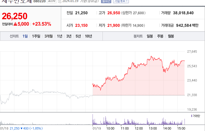 제주반도체의 현재 주가는 26,250원이며 전일 대비 원의 모습을 보이고 있습니다. 제주반도체의 대주주인 박성식(외 5인)은 지분 12.12%를 소유하고 있습니다. 이 회사는 반도체 및 관련 장비 분야에서 활동하고 있으며, 장중 기준 주가는 26,250원입니다. 제주반도체의 시가 총액은 9041억 원이며 발행 주식수는 34,442,833주입니다. 외국인 보유 비중은 3.46%이며, 장중 거래량은 38,373,069주입니다. 또한, 이 회사는 매출액으로 1,114억 원을 달성했습니다.