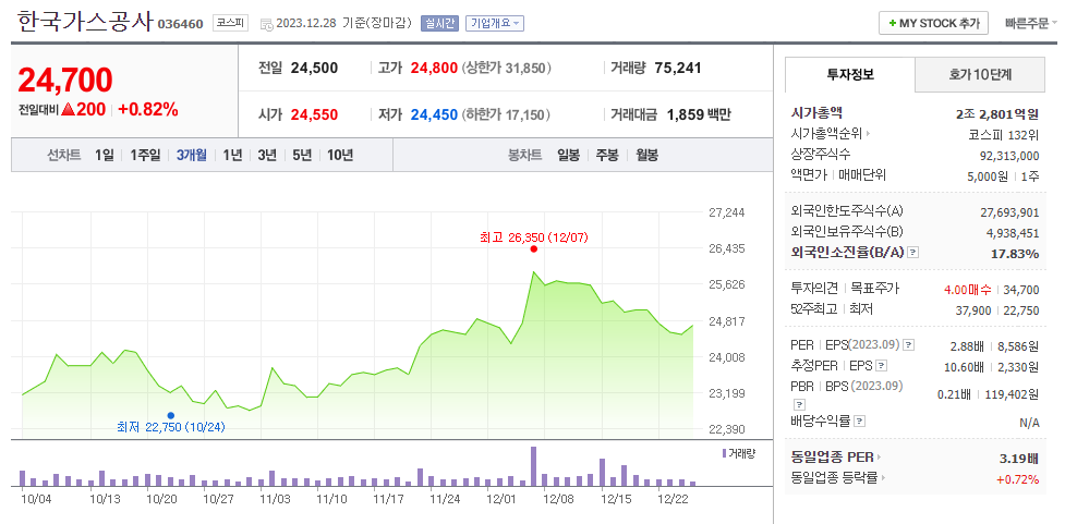 한국가스공사 현재 주가는 24,500원이며 전일 대비 -50원의 모습을 보이고 있습니다. 한국가스공사의 주주현황을 살펴보면 대한민국정부(기획재정부)(외 1인)이 지분 46.63%를 소유하고 있습니다. 한국가스공사는 가스 기업으로 장중 기준으로 주가는 24,500원 입니다. 한국가스공사의 시가 총액은 2조2801억 원이며 발행 주식수는 5.35주 입니다. 외국인 보유 비중은 118,998% 이며 장중 거래량은 92,313,000를 기록했습니다. 매출액은 339,468억 원, 영업이익은 24,634억 원을 달성했습니다. EPS는 2,330원이며 한국가스공사 주식 배당수익률은 % 입니다.