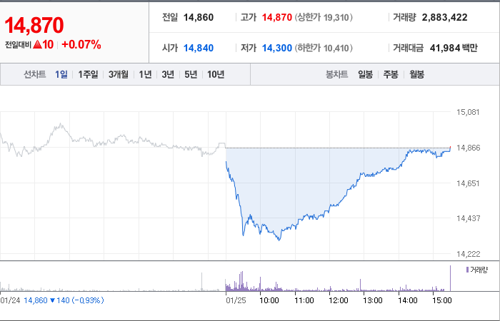 두산에너빌리티의 현재 주가는 14,860원이며 전일 대비 -140원으로 하락하고 있습니다. 주주현황을 살펴보면, 두산(외 26인)이 지분의 30.67%를 소유하고 있습니다. 이 회사는 기계 기업으로, 현재 주가는 14,860원입니다. 시가 총액은 9조5251억 원이며 발행 주식수는 640,561,146주입니다. 외국인 보유 비중은 14.91%이고, 장중 거래량은 1,197,281주입니다. 매출액은 127,354억 원입니다.