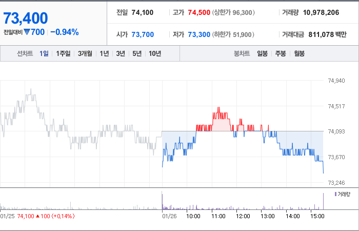 삼성전자의 현재 주가는 73,400원이며 전일 대비 -700원의 변동을 보이고 있습니다. 삼성전자의 대주주(외 15인)은 지분의 20.20%를 소유하고 있습니다. 삼성전자는 반도체 및 관련 장비 기업으로, 현재 주가는 73,400원입니다. 시가 총액은 438조1820억 원이며 발행 주식수는 5,969,782,550주입니다. 외국인의 보유 비중은 54.39%이며 장중 거래량은 11,160,062주입니다. 또한, 삼성전자는 매출액으로 1,911,556억 원을 달성했습니다.