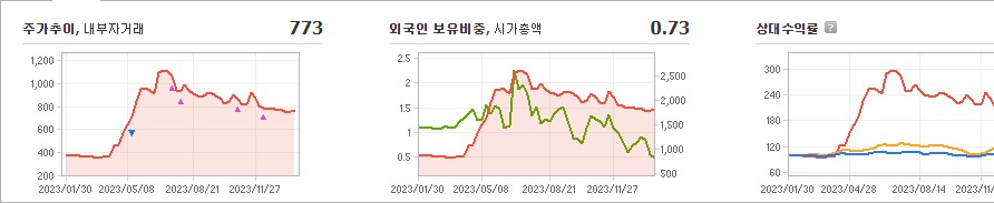 KIB플러그에너지의 현재 주가는 773원이며, 전일 대비 -0.90원으로 하락하고 있습니다. 주주 현황을 살펴보면 케이아이비패밀리블라인드(외 5인)이 지분의 23.26%를 소유하고 있습니다. KIB플러그에너지는 기계 기업으로, 현재 주가는 773원입니다. 시가 총액은 1284억 원이며, 발행 주식수는 236,981,544주입니다. 외국인 보유 비중은 0.73%이며, 거래량은 5,256,223주입니다. 매출액은 964억 원을 기록하였습니다.