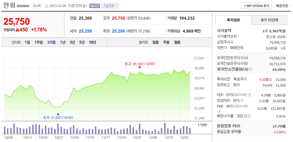 이 글에서는 한화 주가 전망과 목표 주가, 기업 정보에 대해서 설명합니다. 주식 투자에서 핵심은 미래의 기업 가치를 예상하고 선제적으로 움직이는 것입니다. 투자 대상을 결정하기 전에 현재 기업의 현황과 수치를 검토하는 것이 필요합니다. 한화 주식의 주요 현황과 투자 정보를 확인하시고 주식 투자에 도움이 될 만한 정보들을 모아 놓았으니 투자를 고려하실 때 참고하세요..