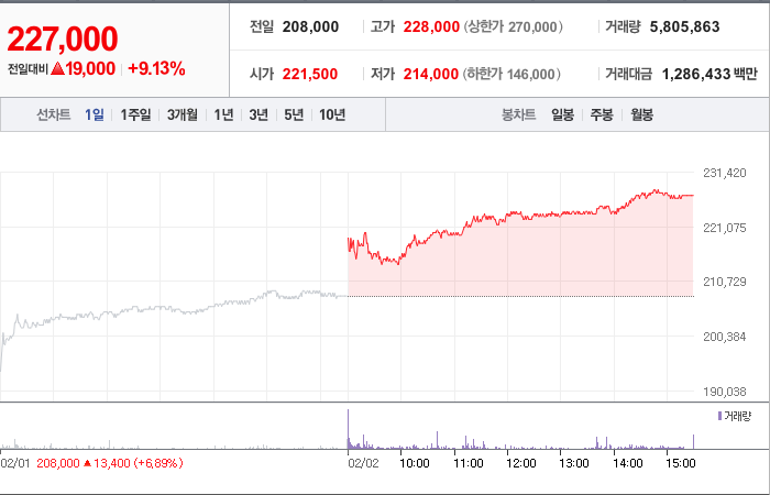현대차 주가는 현재 227,000원으로 전일 대비 상승하고 있습니다. 현대차의 대주주는 현대모비스(외 9인)로, 지분 비율은 29.68%입니다. 현대차는 자동차 기업으로, 현재 주식 시가 총액은 48조177억 원이며 발행 주식수는 211,531,506주입니다. 외국인 보유 비중은 35.30%이고, 장중 거래량은 5,844,398주입니다. 또한, 현대차의 매출액은 1,210,311억 원입니다.