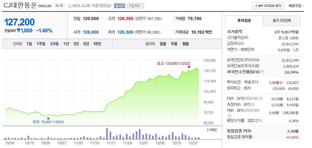 CJ대한통운 현재 주가는 129,000원이며 전일 대비 원의 모습을 보이고 있습니다. CJ대한통운의 주주현황을 살펴보면 CJ제일제당(외 2인)이 지분 40.18%를 소유하고 있습니다. CJ대한통운는 육상운수 기업으로 장중 기준으로 주가는 129,000원 입니다. CJ대한통운의 시가 총액은 2조9017억 원이며 발행 주식수는 12.74주 입니다. 외국인 보유 비중은 75,777% 이며 장중 거래량은 22,812,344를 기록했습니다. 매출액은 87,073억 원, 영업이익은 4,118억 원을 달성했습니다. EPS는 9,418원이며 CJ대한통운 주식 배당수익률은 0.53% 입니다.