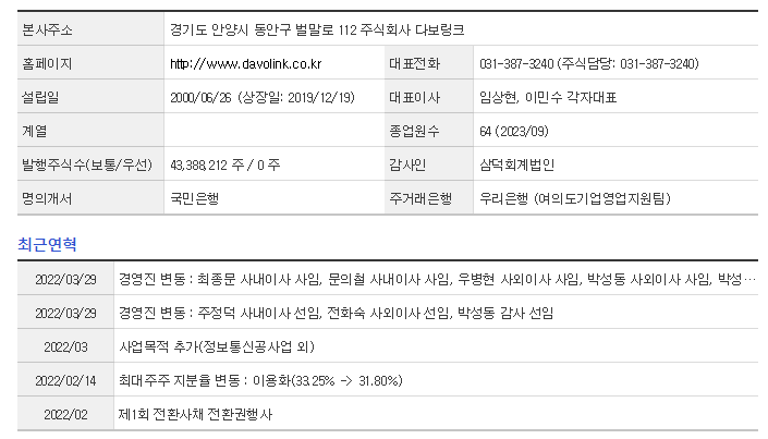 다보링크는 통신장비 기업입니다. 대표자는 임상현, 이민수 각자대표 이며 설립일은 2019/10/17, 주식 상장일은 2019/12/19입니다. 전체 종업원 수는64명 이고 본사 주소는 경기도 안양시 동안구 벌말로 112 주식회사 다보링크입니다.