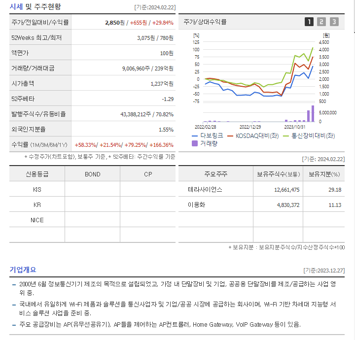 -2023년 9월 전년동기 대비 별도기준 매출액은 7.2% 증가, 영업손실은 65.4% 감소, 당기순손실은 65.2% 감소. 2022년 기말 기준, 매출액의 79.7%가 통신 3사 등으로부터 발생되고 있음. 2023년 3분기 기준, 견조한 AP 실적과 함께 손익 외형이 안정화 되고 있음. '테라사이언스'는 사업다각화를 위해 동사의 지분 37.55%를 확보하며 새로운 최대주주가 됨. 동사는 테라사이언스의 자회사로 편입될 예정임.