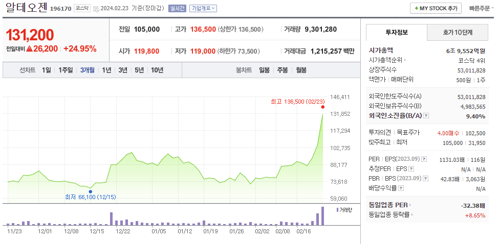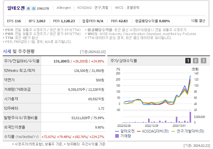 알테오젠 현재 주가는 131,200원이며 전일 대비 원의 모습을 보이고 있습니다. 알테오젠의 주주현황을 살펴보면 박순재(외 4인)이 지분 23.97%를 소유하고 있습니다. 알테오젠는 바이오 기업으로 장중 기준으로 주가는 131,200원 입니다. 알테오젠의 시가 총액은 6조9552억 원이며 발행 주식수는 9.90주 입니다. 외국인 보유 비중은 9,359,073% 이며 장중 거래량은 53,011,828를 기록했습니다. 매출액은 742억 원, 영업이익은 -294억 원을 달성했습니다. EPS는 189원이며 알테오젠 주식 배당수익률은 69,552% 입니다.