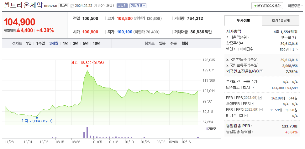 셀트리온제약 현재 주가는 104,900원이며 전일 대비 원의 모습을 보이고 있습니다. 셀트리온제약의 주주현황을 살펴보면 셀트리온(외 11인)이 지분 54.97%를 소유하고 있습니다. 셀트리온제약는 제약 기업으로 장중 기준으로 주가는 104,900원 입니다. 셀트리온제약의 시가 총액은 4조1554억 원이며 발행 주식수는 7.95주 입니다. 외국인 보유 비중은 768,413% 이며 장중 거래량은 39,613,016를 기록했습니다. 매출액은 2,936억 원, 영업이익은 382억 원을 달성했습니다. EPS는 없음원이며 셀트리온제약 주식 배당수익률은 0.72% 입니다.
