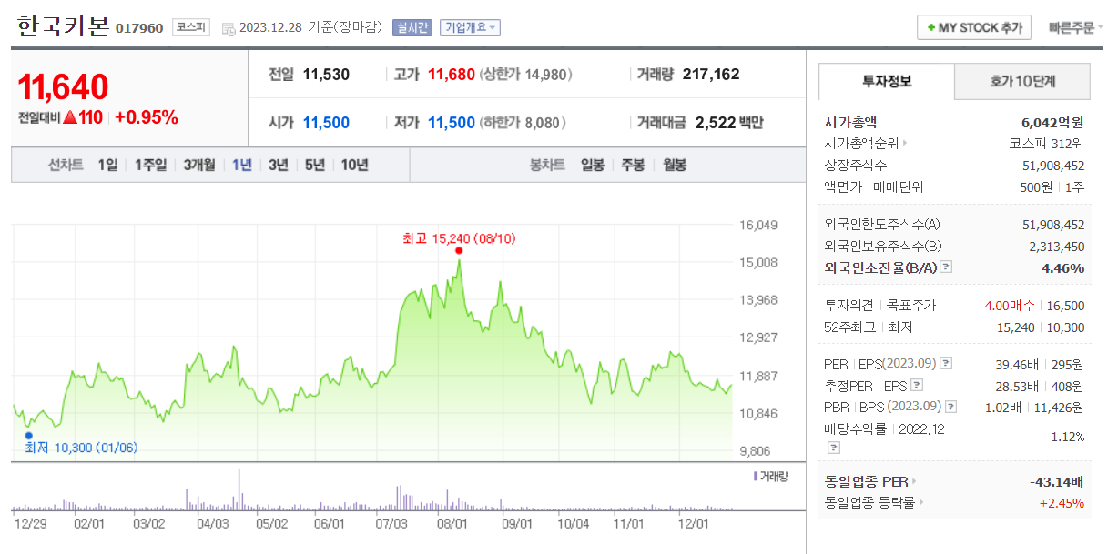 한국카본 현재 주가는 11,640원이며 전일 대비 -7.18원의 모습을 보이고 있습니다. 한국카본의 주주현황을 살펴보면 조문수(외 4인)이 지분 34.28%를 소유하고 있습니다. 한국카본는 화학 기업으로 장중 기준으로 주가는 11,640원 입니다. 한국카본의 시가 총액은 6042억 원이며 발행 주식수는 4.54주 입니다. 외국인 보유 비중은 218,663% 이며 장중 거래량은 51,908,452를 기록했습니다. 매출액은 3,925억 원, 영업이익은 248억 원을 달성했습니다. EPS는 408원이며 한국카본 주식 배당수익률은 1.14% 입니다.