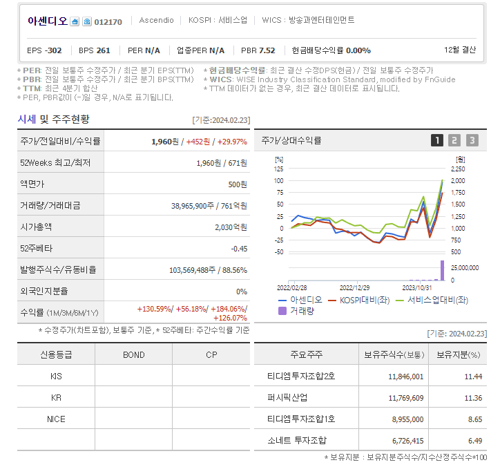 아센디오 현재 주가는 1,960원이며 전일 대비 원의 모습을 보이고 있습니다. 아센디오의 주주현황을 살펴보면 이 지분 11.44%를 소유하고 있습니다. 아센디오는 미디어 기업으로 장중 기준으로 주가는 1,960원 입니다. 아센디오의 시가 총액은 2030억 원이며 발행 주식수는 0.00주 입니다. 외국인 보유 비중은 38,965,875% 이며 장중 거래량은 103,569,488를 기록했습니다. 매출액은 71억 원, 영업이익은 -90억 원을 달성했습니다. EPS는 없음원이며 아센디오 주식 배당수익률은 1.00% 입니다.