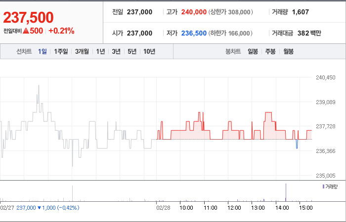 한국쉘석유의 현재 주가는 237,000원이며 전일 대비 -1,000원으로 하락하였습니다. 주주현황을 살펴보면 한국쉘석유의 지분은 53.85%를 소유하고 있습니다. 이 회사는 화학 기업으로, 장중 기준으로 주가는 237,000원입니다. 시가 총액은 3,088억 원이며 발행 주식수는 1,300,000주입니다. 외국인 보유 비중은 58.09%이며, 장중 거래량은 1,868주를 기록했습니다. 또한, 한국쉘석유의 매출액은 2,406억 원을 달성했습니다.