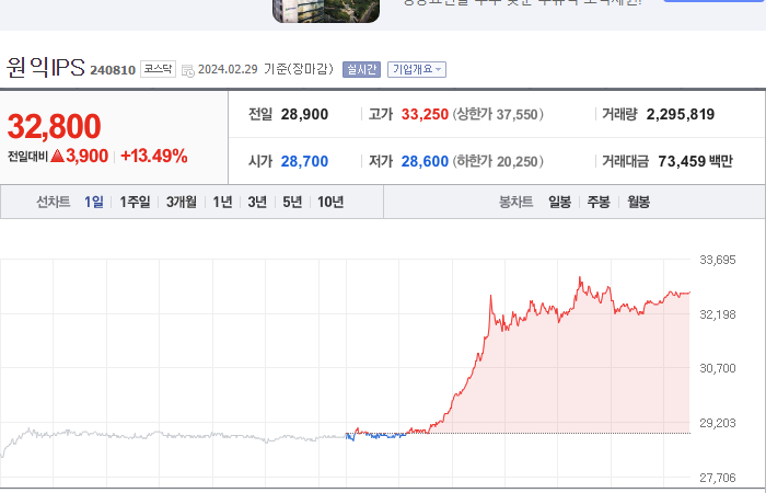 원익IPS의 현재 주가는 32,800원이며 전일 대비 -4.09원 하락하였습니다. 원익IPS의 대주주는 원익홀딩스(외 5인)로써 지분의 33.05%를 소유하고 있습니다. 원익IPS는 반도체 및 관련 장비 기업으로, 현재 주가는 32,800원입니다. 시가 총액은 1조 6100억 원이며, 발행 주식수는 49,083,901주입니다. 외국인 보유 비중은 22.57%이며, 장중 거래량은 2,311,257주를 기록했습니다. 또한, 매출액은 4,649억 원을 달성했습니다.