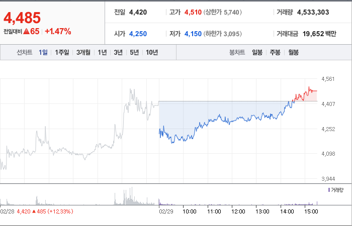 현재 쇼박스의 주가는 4,485원이며 전일 대비 원의 모습을 보이고 있습니다. 오리온홀딩스(외 1인)이 쇼박스의 주주로서 지분 57.47%를 소유하고 있습니다. 쇼박스는 미디어 기업으로서, 장중 기준으로 주가는 4,485원입니다. 시가 총액은 2809억 원이며 발행 주식수는 62,638,000주입니다. 외국인 보유 비중은 0.90%이며, 장중 거래량은 4,838,136주를 기록했습니다. 또한, 쇼박스는 매출액으로 326억 원을 달성했습니다.