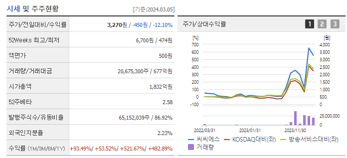씨씨에스 현재 주가는 3,270원이며 전일 대비 -450원의 모습을 보이고 있습니다. 씨씨에스의 주주현황을 살펴보면 유인무(외 2인)이 지분 8.33%를 소유하고 있습니다. 씨씨에스는 미디어 기업으로 장중 기준으로 주가는 3,270원 입니다. 씨씨에스의 시가 총액은 2381억 원이며 발행 주식수는 2.23주 입니다. 외국인 보유 비중은 20,675,251% 이며 장중 거래량은 65,152,039를 기록했습니다. 매출액은 144억 원, 영업이익은 6억 원을 달성했습니다. EPS는 없음원이며 씨씨에스 주식 배당수익률은 -3% 입니다.