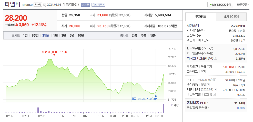 티엘비 주가 분석