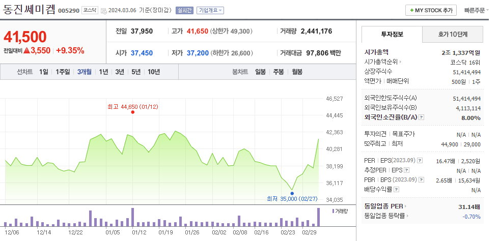 이 글에서는 동진쎄미켐 주가 전망과 목표 주가, 기업 정보에 대해서 설명합니다. 주식 시장에서 중요한 것은 미래의 기업 가치를 예측하고 선제적으로 움직이는 것입니다. 투자 대상을 선택하기 전에 현재 기업의 현황과 데이터를 확인하는 것이 필요합니다. 동진쎄미켐 주식의 주요 현황과 투자 정보를 확인하시고 주식 투자에 도움이 되는 자료를 모아두었으니 참고하셔서 투자에 도움을 받으시길 바랍니다..